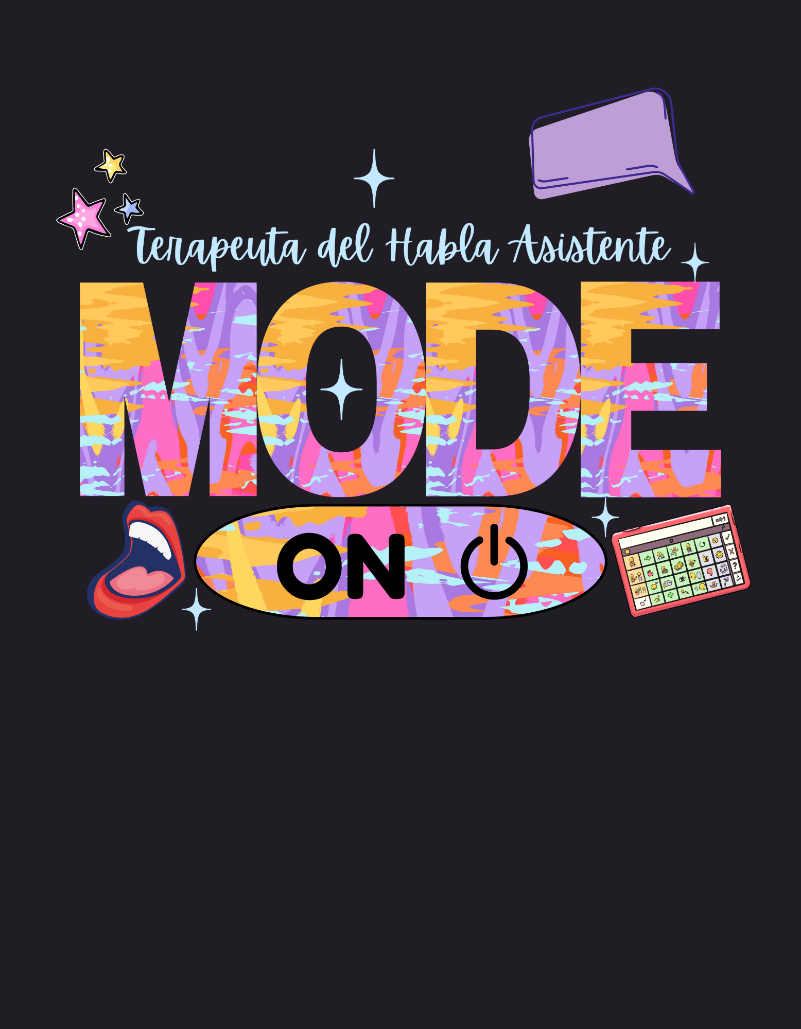 This t-shirt comes in English and Spanish for Speech language pathologists and Speech language pathologist assistants. In our field, we are always working so it is "mode on" everyday of the week. Enjoy this style!
